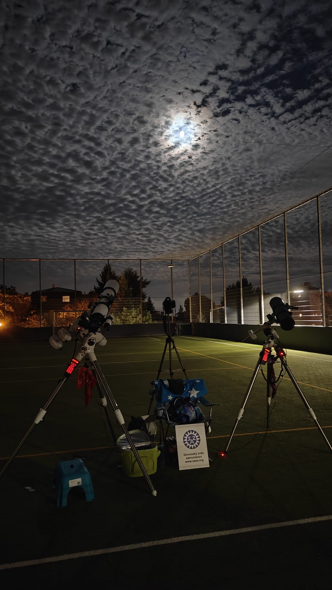 Keď už som začal byť zachrípnutý, zvolal som „Rasťóoo“, a on v rozprávaní pokračoval, tentokrát už úplne seriózne, tak ako sa na hvezdára patrí. Vysvetlil snáď všetko čo bolo v súvislosti s Mesiacom a zatmením potrebné. Ďalšie diskusie, otázky a odpovede už boli pri jednotlivých stanovištiach a netýkali sa len zatmenia. Podchvíľou zazvonil telefón, či prišla SMS: „Tak ako je to u vás?“; „Ešte pred chvíľkou sa zdalo, že to bude OK, no teraz...“; U nás sa počasie umúdrilo a užívame si to“. Často sme však sledovali so zamračenými pohľadmi oblohu, veď už sa dostatočne zotmelo a Mesiac, už celý v tieni, sa stále skrýval, až zrazu sa „čosi červenkasté“ medzi mrakmi ukázalo. „Hurá, to je Mesiac, konečne!“ Nadšenie striedalo sklamanie, počasie sa s nami zahrávalo. Od zenitu cez západ až po sever bolo vcelku jasno a tak prišla na rad prehliadka súhvezdí či nejakých objektov. Tí čo vydržali až do konca si to nakoniec užili a nielen Mesiac ale pri ňom aj Saturn. Sami si skúšali fotografovať aj mobilmi za okulárom, a aj keď to nebolo to prvé orechové, mali predsa len to svoje zatmenie či Saturn s prstencom. Ku koncu polotieňového zatmenia sme už začali baliť, do Komárna som prišiel až hodinu po polnoci. Komunikačné kanály a sociálne siete za zapĺňali obrázkami, niektorým sme trošku aj závideli. Bola to náročná, no aj tak krásna desaťhodinová šichta 😊.