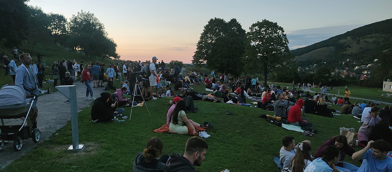 Lúka bola zaplnená zatmeniachtivými návštevníkmi sa dekách či karimatkách, mnohí s fotoaparátmi aj ďalekohľadmi, a často zaznievala otázka či niečo uvidíme. U hvezdárov, zvlášť pri zaujímavých pozorovaniach, je optimizmus povinný, tak znela naša odpoveď. Ak by sme nakoniec neboli videli vôbec nič, bolo by sme sklamaní nielen my, ale aj vyše 1 000 ľudí.