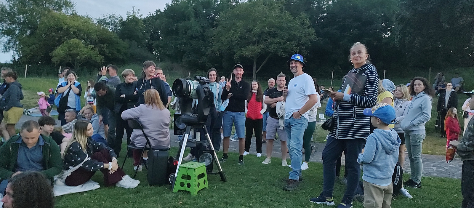 Slnko bolo ešte nad obzorom, no lúka sa pomaličky zapĺňala a zvlášť deti už niečo chceli vidieť 😊. Skvelým objektom bol pozlátený kríž Farského kostola Svätého kríža, aspoň ako ukážka, k čomu slúži ďalekohľad (veď ním hľadíme do ďaleka). „Ujo, veď ten kríž je naopak“ – nuž a už sme mali o čom hovoriť ešte za svetla.