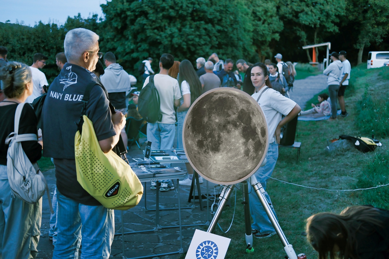 Na hrad sme došli poldruha hodiny pred západom Slnka a to už boli kolegovia v plnej práci, vítali nás postery, inštalovali sa montáže. Dve stanovištia boli na okraji príjazdovej cesty a tri ďalšie o niečo vyššie pri odkrytých základoch veľkomoravského kostola, ktorý sa datuje do čias kniežaťa Rastislava. Všetkých upútal svietiaci panel s Mesiacom v splne a Natália sa zvŕtala okolo stolíkov a škatúľ s propagačnými materiálmi, a to nielen k zatmeniu, ale aj svetelnému znečisteniu či meteoritoch na Slovensku. Mali sme aj veľa čísel časopisu Kozmos (ďakujeme, kolegovia z Hurbanova), vrátane toho aktuálneho, kde je práve príspevok o zatmení. Ako pamiatku, či prípadne malú odmenu, dostávali návštevníci aj spomienkovú fotografiu.