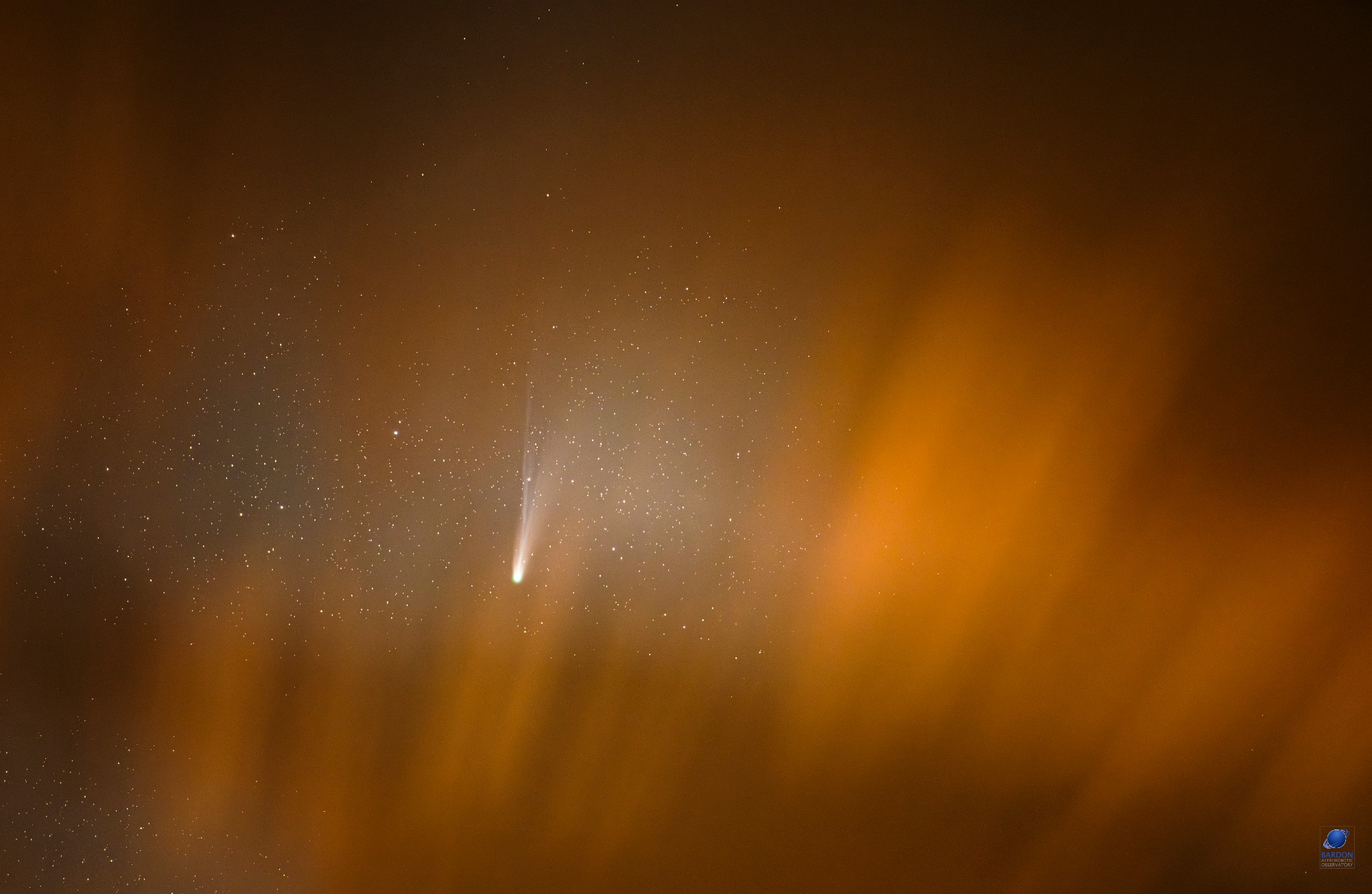 P. Horálek 18. 10. 2025, Nikon Z6III, Nikkor 135 mm, ISO 1000, f1,8, zásobník 40 x 20 s, montáž Vixen Polarie U. Slnečný vietor sa v tento deň krásne prejavil polárnou žiarou aj zmenou štruktúry plazmového chvosta kométy...