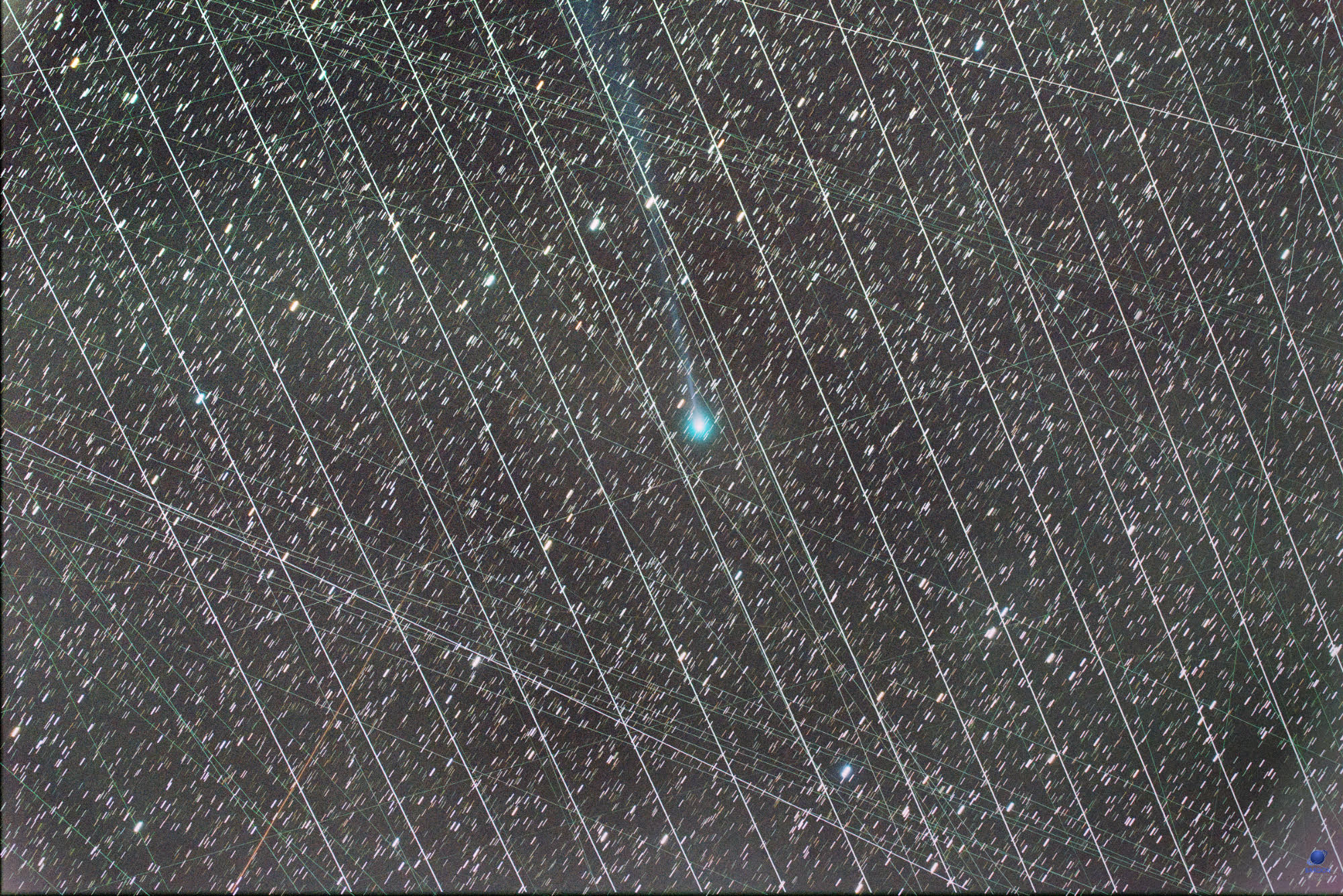 Kométa C/2025 A6 (Lemmon) ako ju nasnímal (29 x 60 s) v Rasoškách náš člen Zd. Bardon, avšak aj s množstvom satelitov... (refr. Tak FSQ-106ED na montáži EM-200 kamerou ZWO ASI6200MC Pro)
