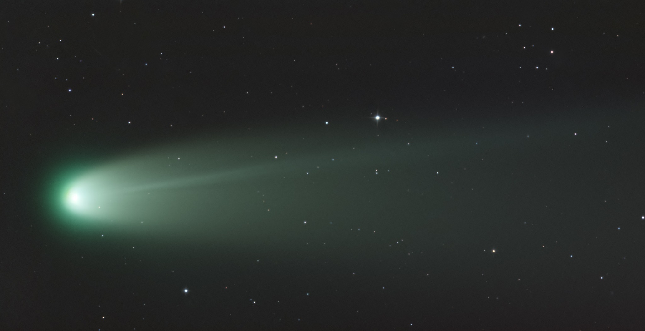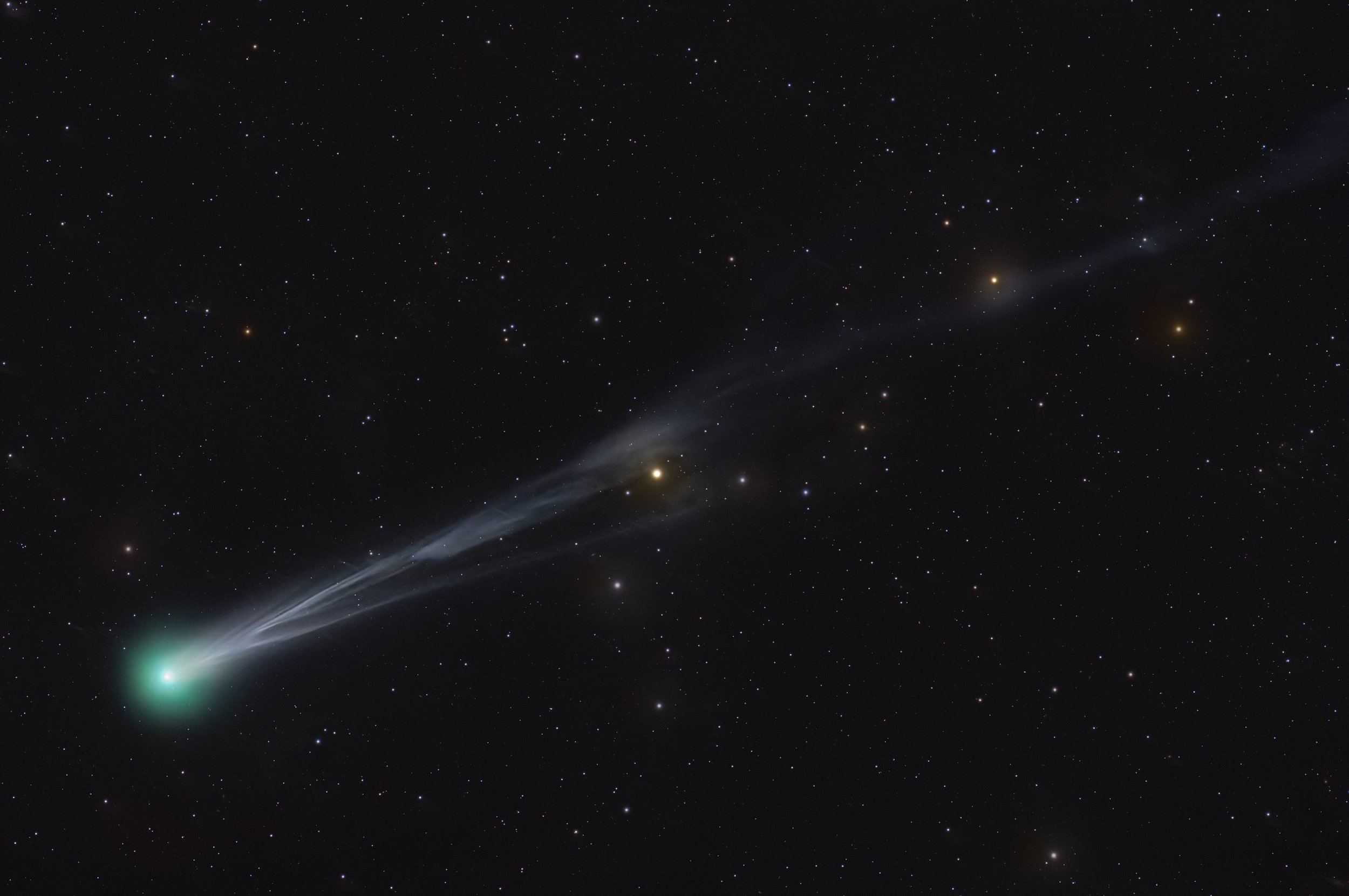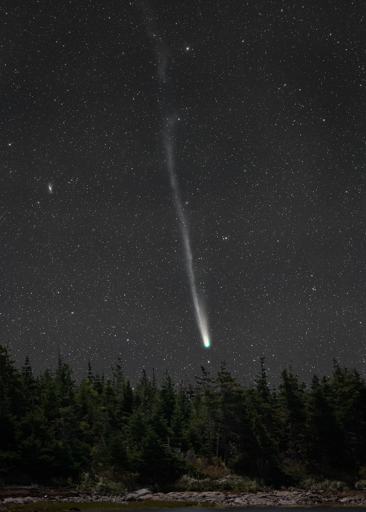 Na skutočne tmavej oblohe je kométa skvelá. Jason L. Dain (RAS Canada), 14. 10. 2025, Nikon D850, ISO 3200, Samyang 2,2/135 mm, 20 x 30s, iOptron Skyguider Pro