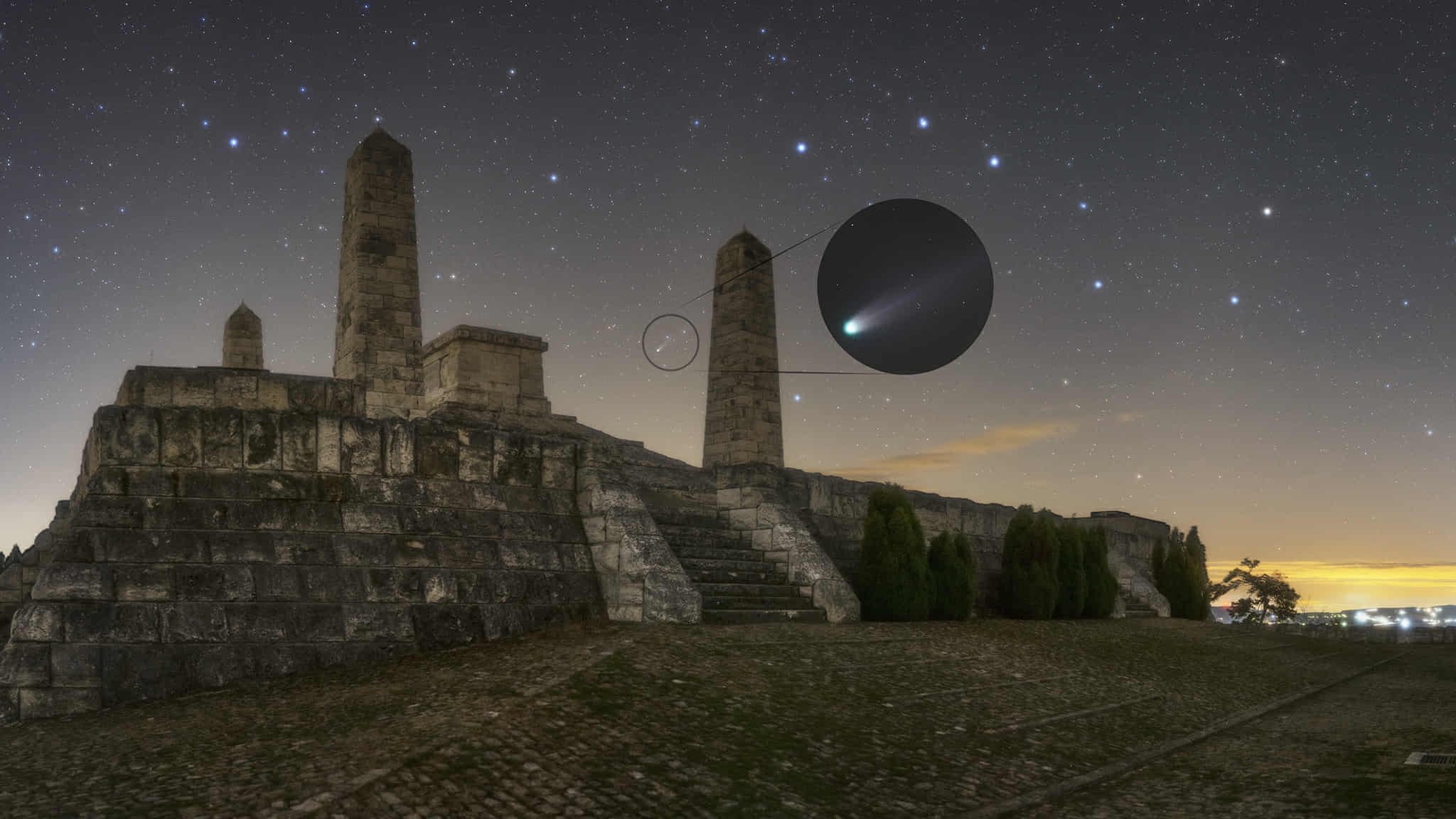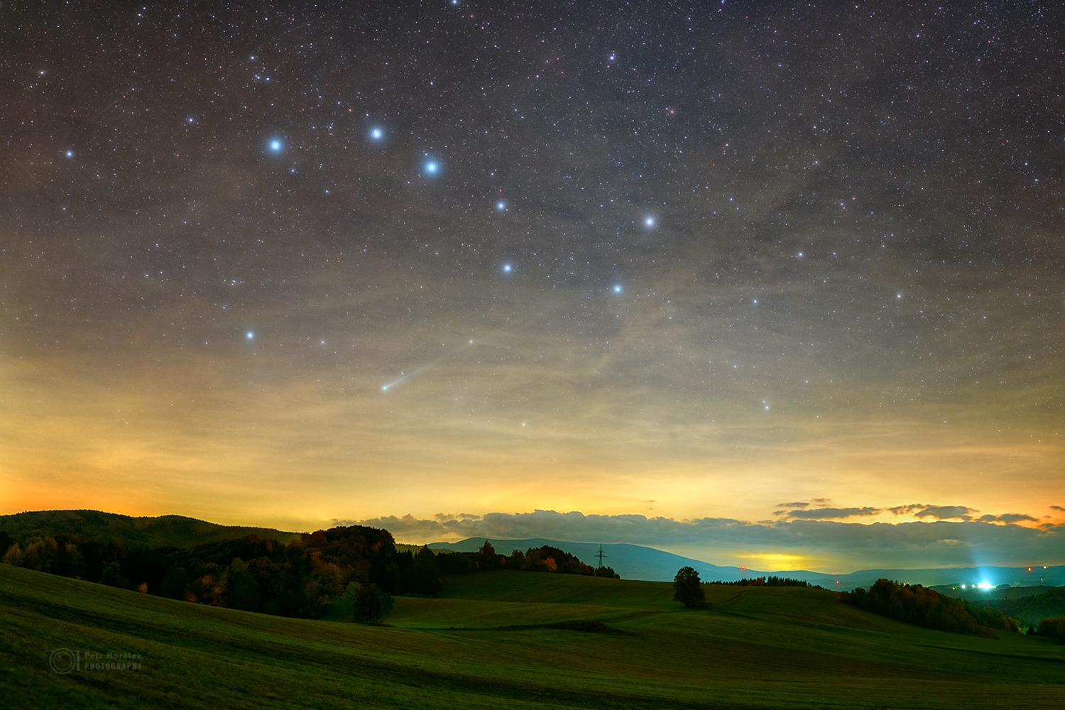 Kométa, aj ako pocta M. R. Štefánikovi. 18.10.2025 ~21:51hod., Brezová pod Bradlom, panoráma O. Králik, detail kométy M. Čincura.
