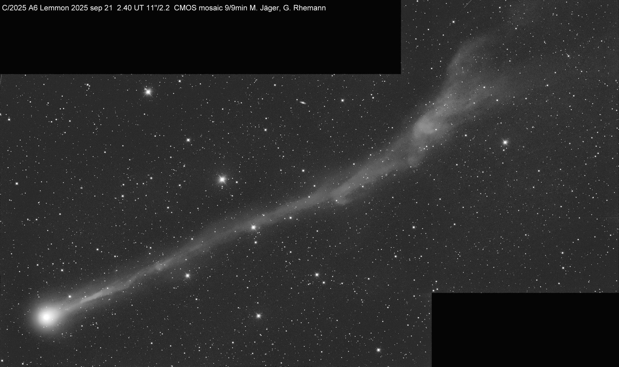 Kométa 21. 9. 2025 s bohato štruktúrovaným plazmovým chvostom (M. Jäger, G. Rhemann)