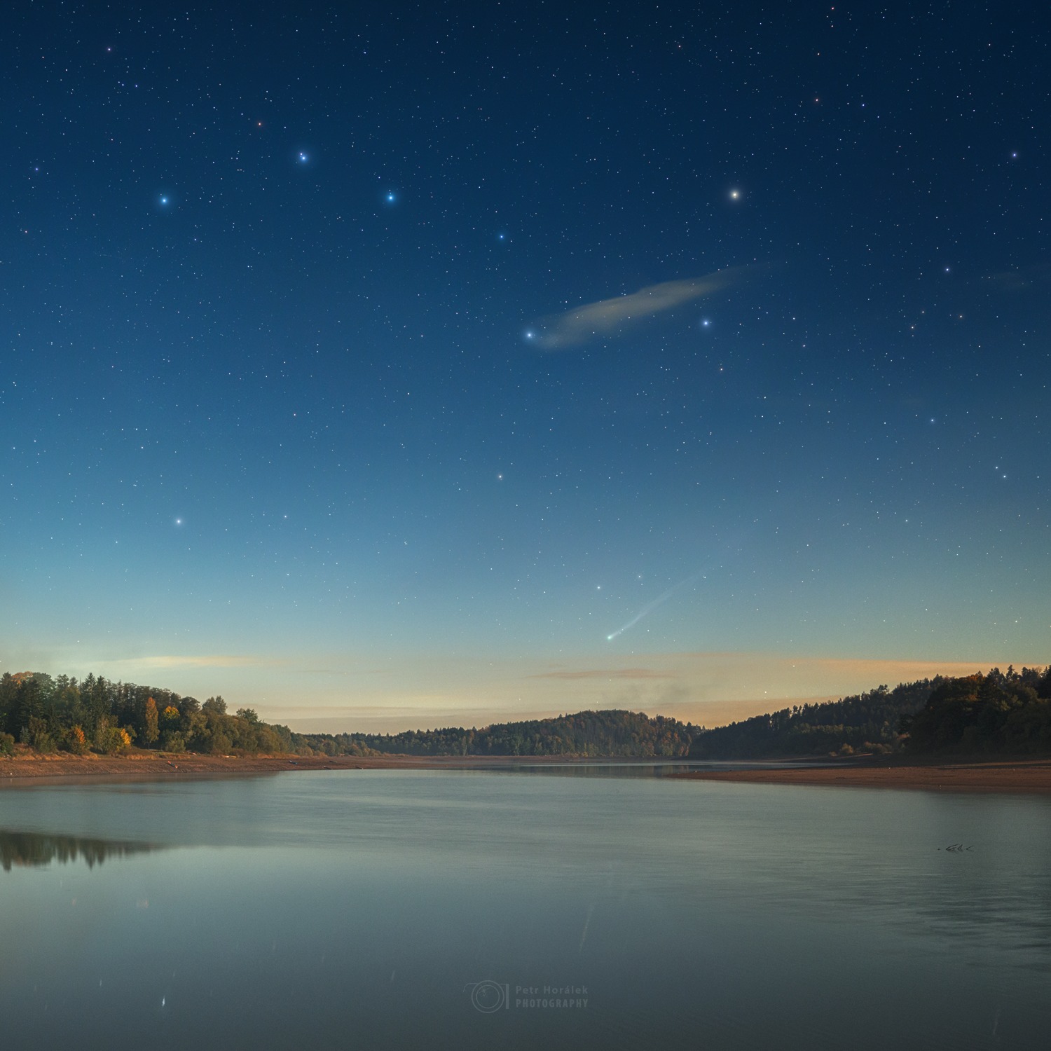 Kométa nad Sečskou priehradou aj s polárnou žiarou (P. Horálek – APOD 20. 10,2025), 18.10.2025 ~19:40 SELČ, Canon Ra, Sigma Art 50 mm, f 1,4, ISO 4000, 43x8 s (pano z jednotlivých záberov zo statívu).