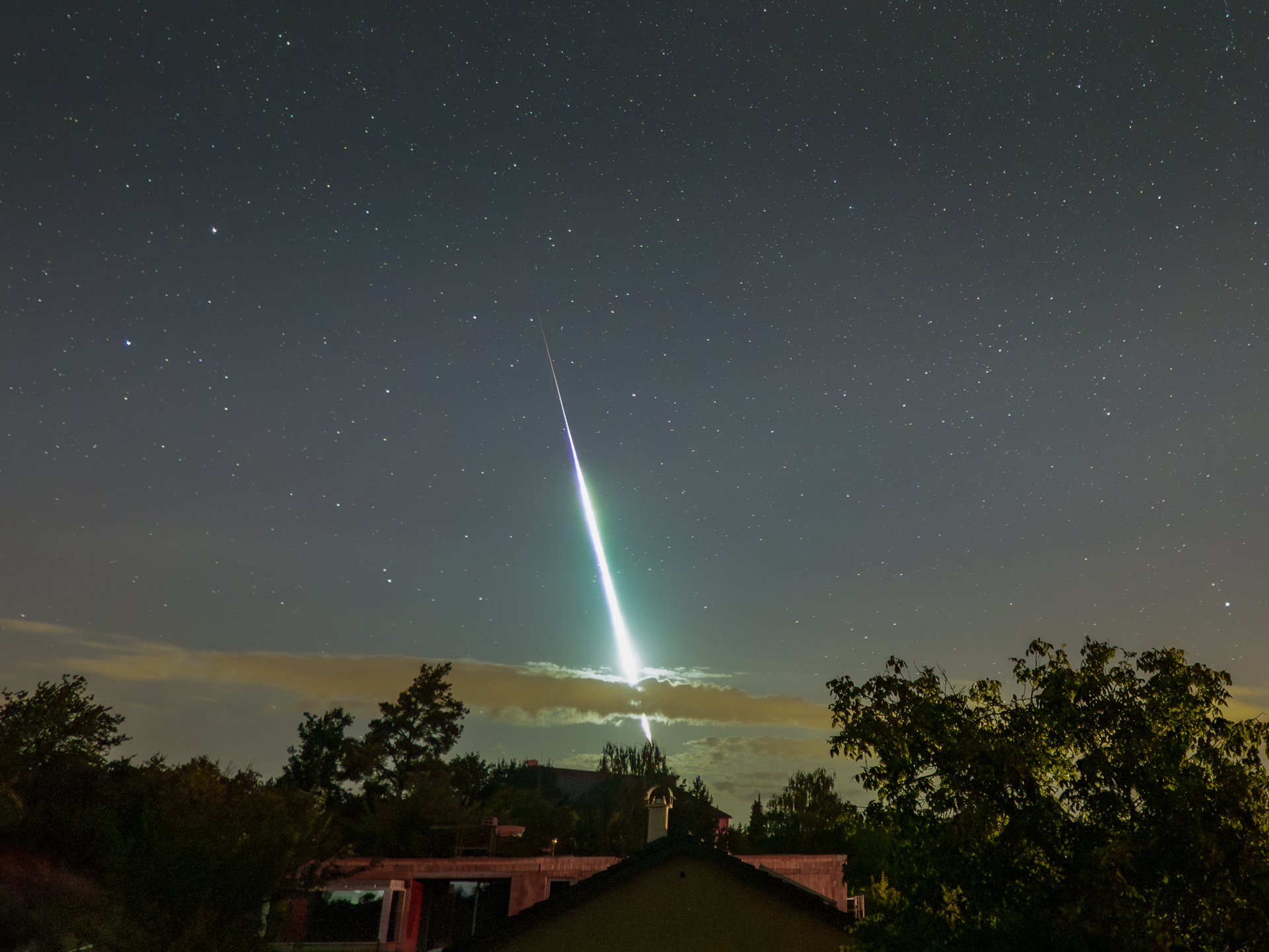 To se ovšem nestalo vítězovi srpnového kola fotografické soutěže „Česká astrofotografie měsíce“ Lukáši Peckovi. Ten se vypravil zachytit nějakou brzkou Perseidu, tedy meteor roje Perseid, pocházející z komety Swift-Tuttle. Měl velké štěstí, že jeho fotoaparát mířil do místa, kudy atmosféra vykreslila krásný a velmi jasný jev meteoru. Co meteoru, bolidu. Jeho jasnost se sice určuje obtížně, ale podle odhadu se blížila spíše jasnosti Měsíce než Venuše. Tedy opravdu jasný. Těleso, které jej způsobilo, muselo mít rozměry minimálně několika desítek centimetrů a hmotnost desítek až stovek kilogramů. Pro srovnání, ty co vidíme dobře našima očima, tedy ty jasnější 3 magnitudy způsobují tělíska 1-2 mm s hmotností do 0,1 g. Velké rozptyly velikostí i jasností jsou způsobeny jednak samozřejmě nejistotou odhadu jasnosti z jednoho snímku, jednak i různou strukturou a hustotou materiálu meteoroidu.