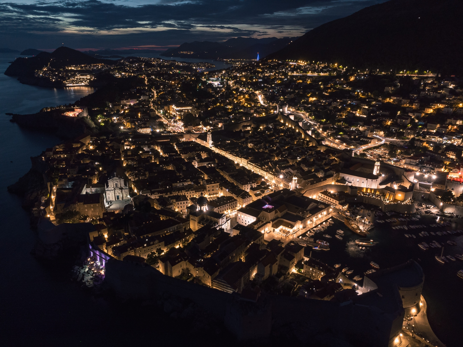 Dubrovník, krásne historické mesto Dalmácie, častý cieľ turistov. Fotografia z malého dronu ukazuje chromaticky dobre nasvietené ulice a zhora je viditeľných len minimum svetelných bodov.