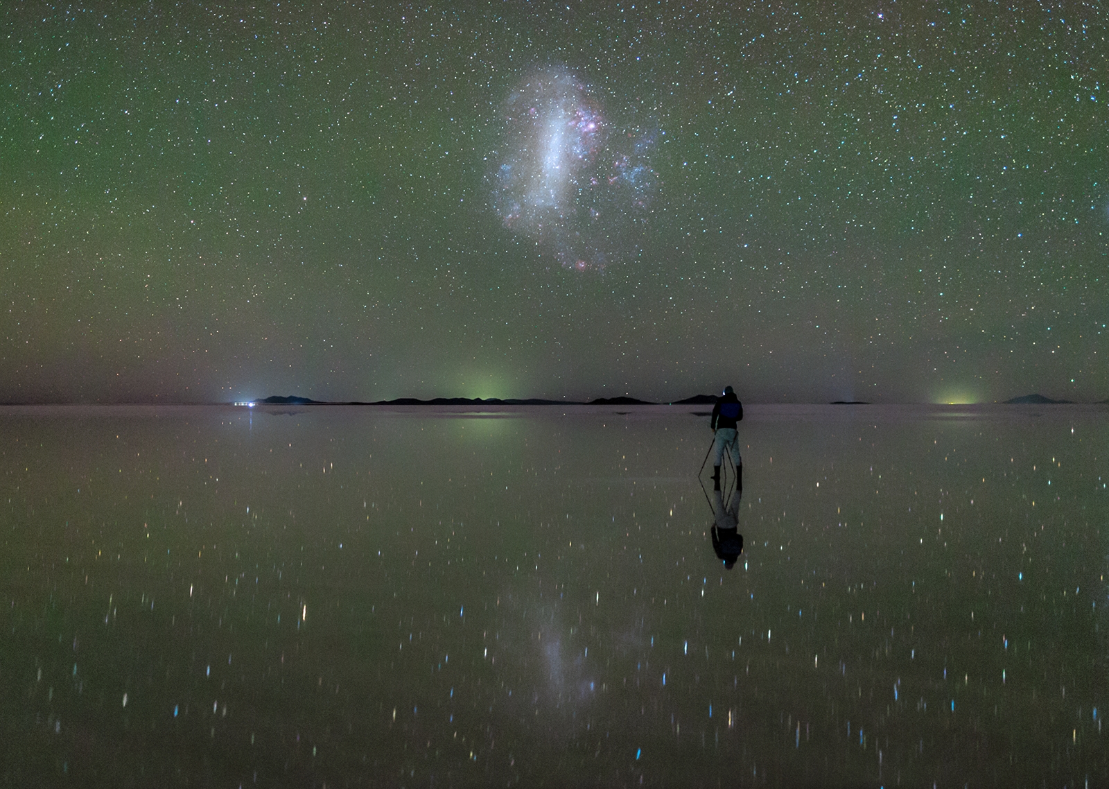 Solná pláň Uyuni v Bolívii ve výšce 3700 metrů v dubnu umí pěkně pošimrat na chodidla i přes holínky a dvoje ponožky. Můj kamarád Matěj Fuchs si v dáli zaznamenával své jedinečné vzpomínky, a patrně ani netušil, že vešel do zorného pole mého aparátu. Toto místo je pro fotografy modlou, pro geology zázrakem a pro cestovatele cílem.Oči adaptované na tmu, takže ten svět, ty dva světy – náš a ten nebeský galaktický – jsem krásně viděl očima i s jejich dokonalým odrazem na tenoučké vrstvě klidné slané vody. Příroda zde nastavuje doslovné zrcadlo. Světu nad hlavou, návštěvníkům, našim duším. Galaxie na snímku je Velké Magellanovo mračno, ležící asi 170 tisíc světelných roků daleko. Je to jen o třetinu více, než kolik má naše Galaxie celá napříč. A obsahuje jen asi desetinu počtu hvězd oproti našemu hvězdnému ostrovu. Přesto jako roztodivný obláček tiše střeží tu jižanskou bolívijskou noc a dobrým duším připomíná, že vesmír nekončí naším komfortním světem. Nejsou to obchoďáky, aplikace v chytrých telefonech, festivaly nebo politika, co tvoří chod našich každodenních slastí a strastí. Nejsou to šperky, nové boty a kabáty, drahé hodinky nebo auta, co nezbytně potřebujeme k přežití a k svému vlastnímu významu ve společnosti. Není to ani krajina, ve které žijeme, co nás definuje a podle jejíž pravidel se musíme řídit, abychom byli pozitivně posuzováni. A že dobro a zlo není dáno tím, jak nám je někteří hlupáci (bohužel u moci) chtějí vnutit, ale je v našem srdci. Je to nějaký vnitřní kodex, nějaký kompas spravedlnosti, který zjevně máme (pokud se ho chtěně i nechtěně nevzdáme) vložený do našeho nitra právě skrze samotný vesmír, jenž nás stvořil, definuje a také jako jediný plně rozhoduje o naší budoucnosti ve svých útrobách.