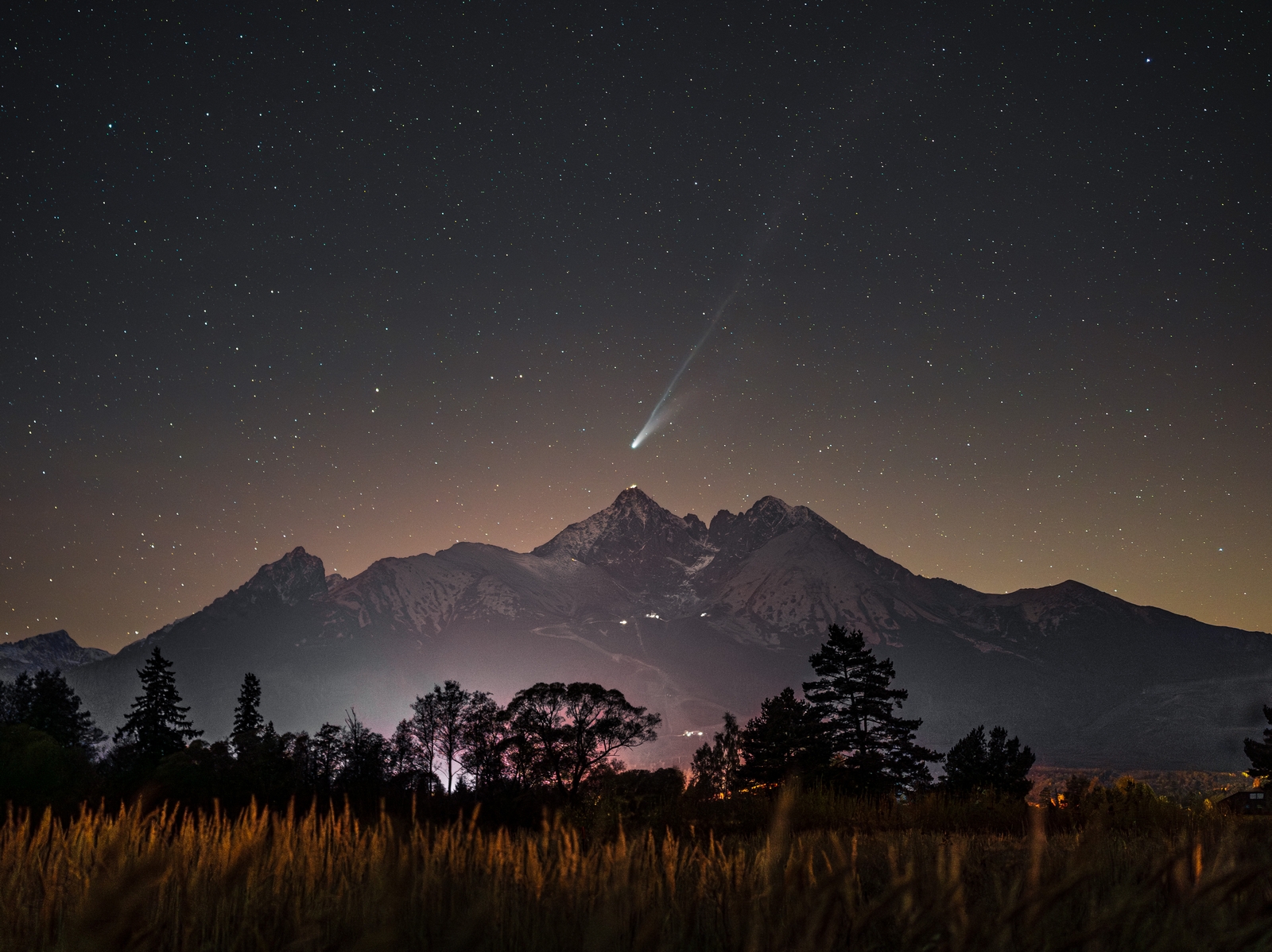 Kométa C/2025 A6 (Lemmon) nad Lomnickým štítom, kde sa nachádza profesionálne pracovisko s celou históriou objavov komét je to miesto, ktoré netreba zvlášť predstavovať. Vypočítať si presnú polohu, odkiaľ sa naskytne takýto pohľad, ktorý sa dá fotograficky zvečniť nie je možno až také náročné, ako zohľadniť pri tom aj negatívny vplyv svetelného znečistenia. Žiaľ, kto hľadá v Tatrách tmu, nemusí to mať až také jednoduché, vzhľadom na nešetrný spôsob, akým svieti väčšina obcí a stredísk plných hotelov, dokonca v zóne národného parku TANAP. Veľmi jasné svetlá Tatranskej Lomnice skrývajúce sa za stromami možno dotvárajú zaujímavú atmosféru na snímke, spolu s popredím osvetľovaným sporadicky diaľkovými svetlami áut z neďalekej cesty, no zberu cenných kometárnych fotónov nijako nepomohli a celkom iste sa nepáčia ani pozemským „obyvateľom“ Tatier. Tí to na rozdiel od ľudí, ktorým by to malo vadiť tiež, nemajú dať väčšinou ako najavo.