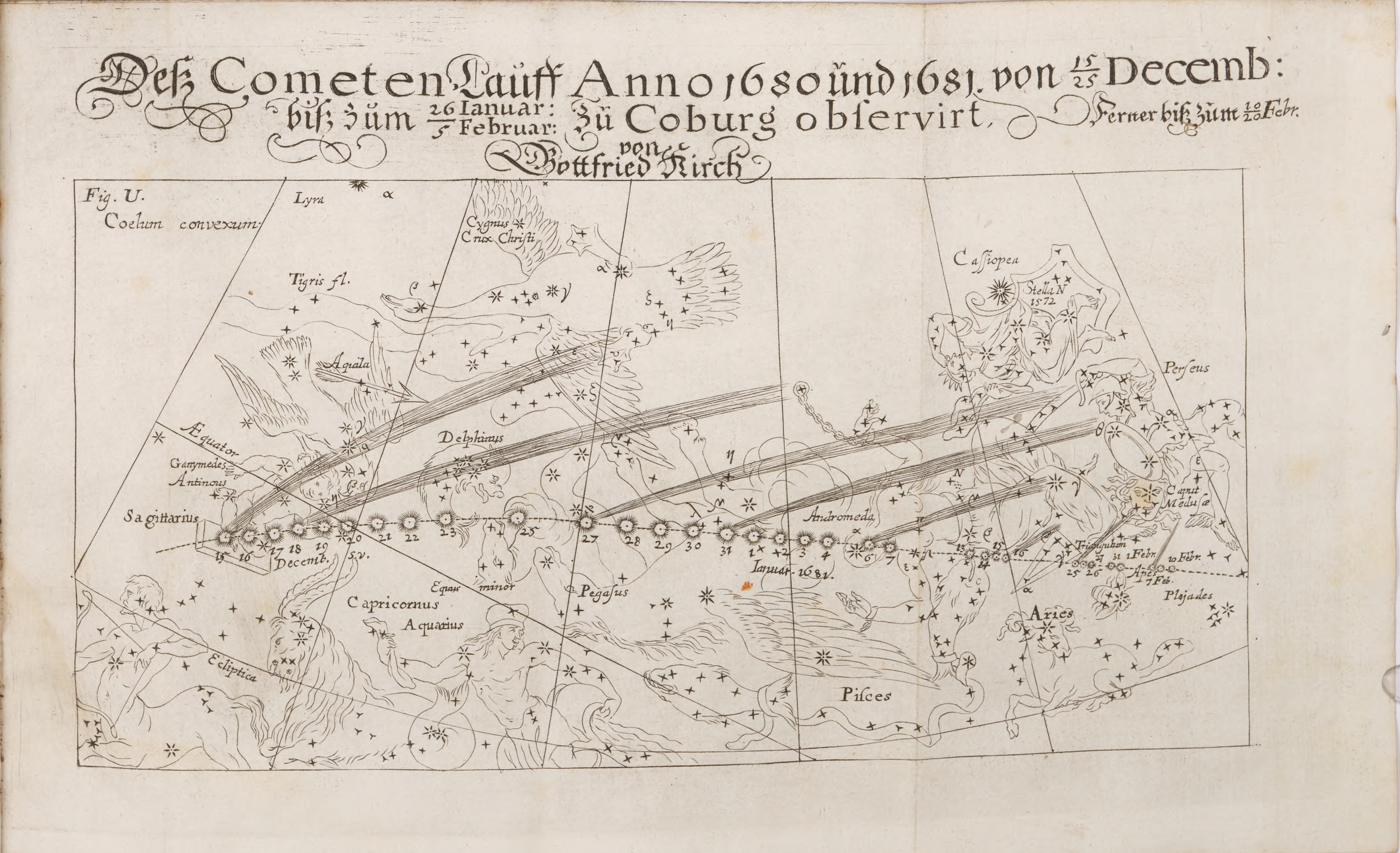 Preklad nadpisu: „Dráha kométy v rokoch 1680 a 1681: od 15./25. decembra do 26. januára a 5. februára, pozorovaná v Coburgu Gottfriedom Kirchom; ďalej až do 12. februára.“