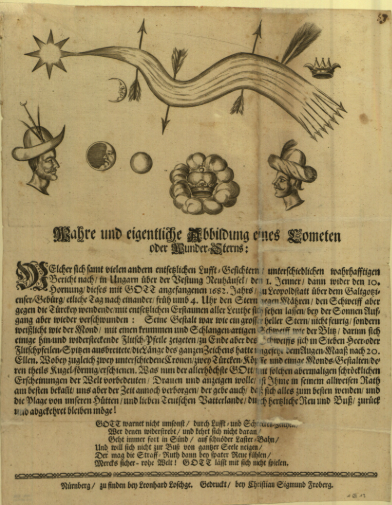 Leták, ktorý máme dnes k dispozícii , bol vydaný v Norimbergu. Text uvádza, že kométa sa ukázala nad pevnosťou Neuhäusel (Nové Zámky) a nad Leopoldstadtom (Leopoldov) v „s Bohom začatom roku 1681“, nadránom okolo štvrtej hodiny. Hviezda sa mala obracať „k Morave“, zatiaľ čo chvost smeroval „k Turecku“. Dnes vieme, že leták v skutočnosti opisuje úkaz z prelomu rokov 1680/1681, čo svedčí o istom časovom posune a nepresnom datovaní – nie nezvyčajnom pri dobových tlačiach šírených v širokom priestore strednej Európy.
