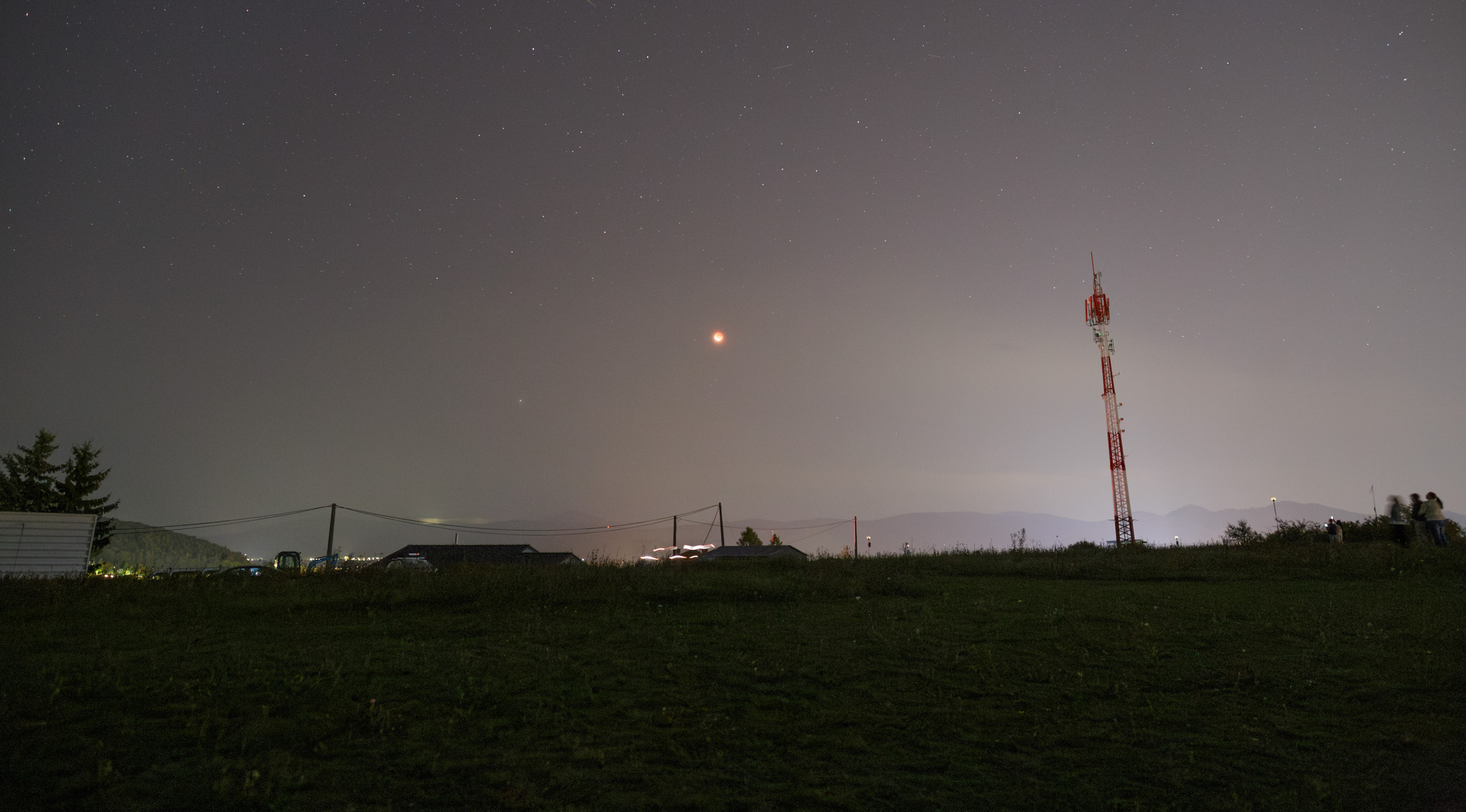 Jedným z najzaujímavejších astronomických úkazov roku 2025 bolo nepochybne zatmenie Mesiaca, ktoré sme mohli sledovať vo večerných hodinách 7. septembra. Miestna organizácia Slovenského zväzu astronómov v Humennom preto zorganizovala verejné pozorovanie na známej lokalite v meste – na kalvárskom kopci. Pre návštevníkov boli pripravené dva ďalekohľady, ako aj fotografická technika s teleobjektívmi. Podmienky priali aspoň čiastočne. Fotograficky sa nám podarilo zachytiť Mesiac krátko po jeho východe spoza Vihorlatských vrchov. O čosi neskôr si mohla verejnosť pozrieť červenkastý Mesiac aj cez ďalekohľady a najmä jeho postupný výstup z tieňa Zeme. Pozorovanie prebiehalo do 21:30 LSEČ a zabezpečovali ho členovia miestnej organizácie Róbert Adam, Štefan Gojdič a Tomáš Medulka.