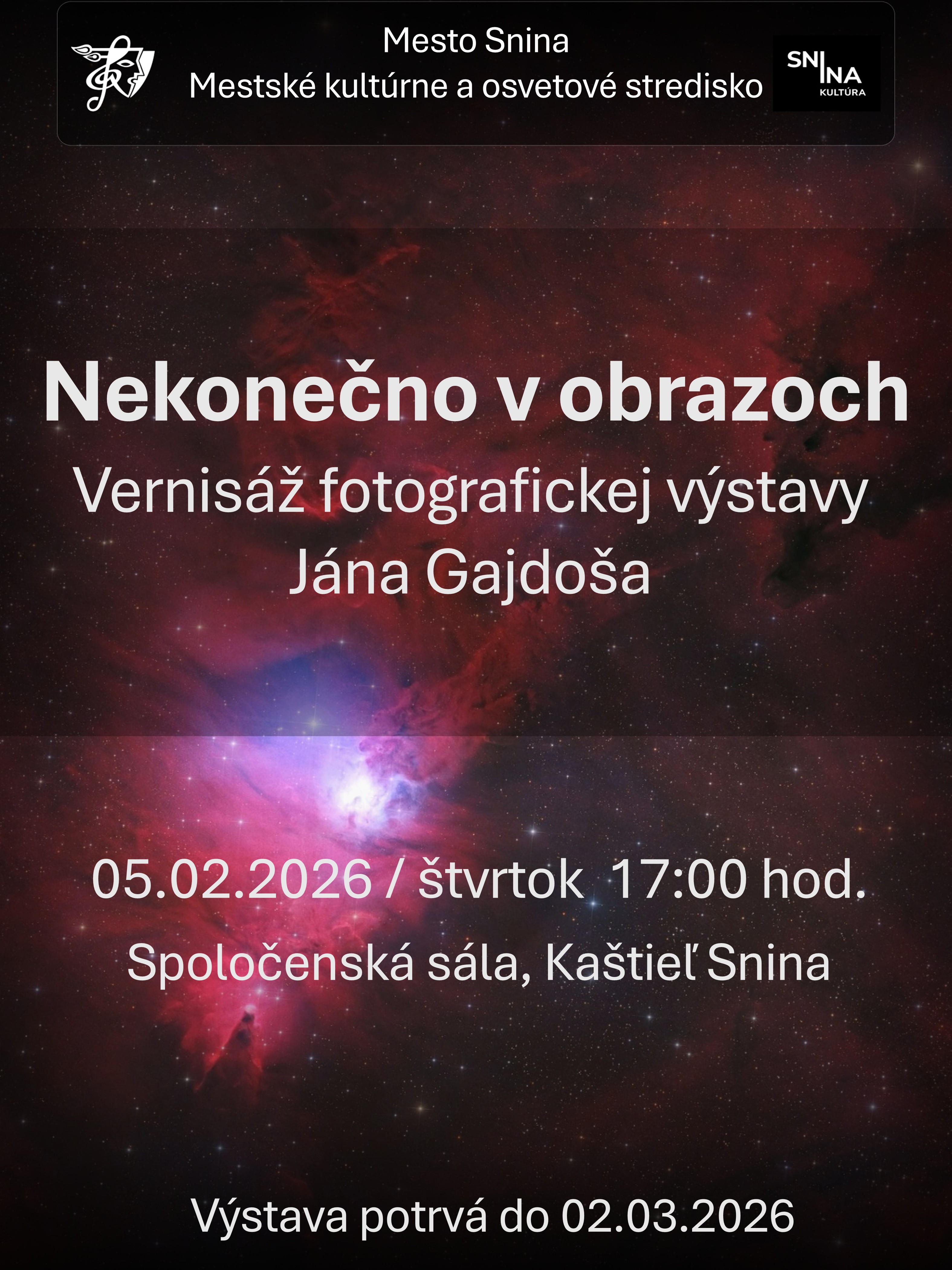 Dávam do pozornosti vernisáž mojich astrofotografií v galérii v Snine 5.2.2026.