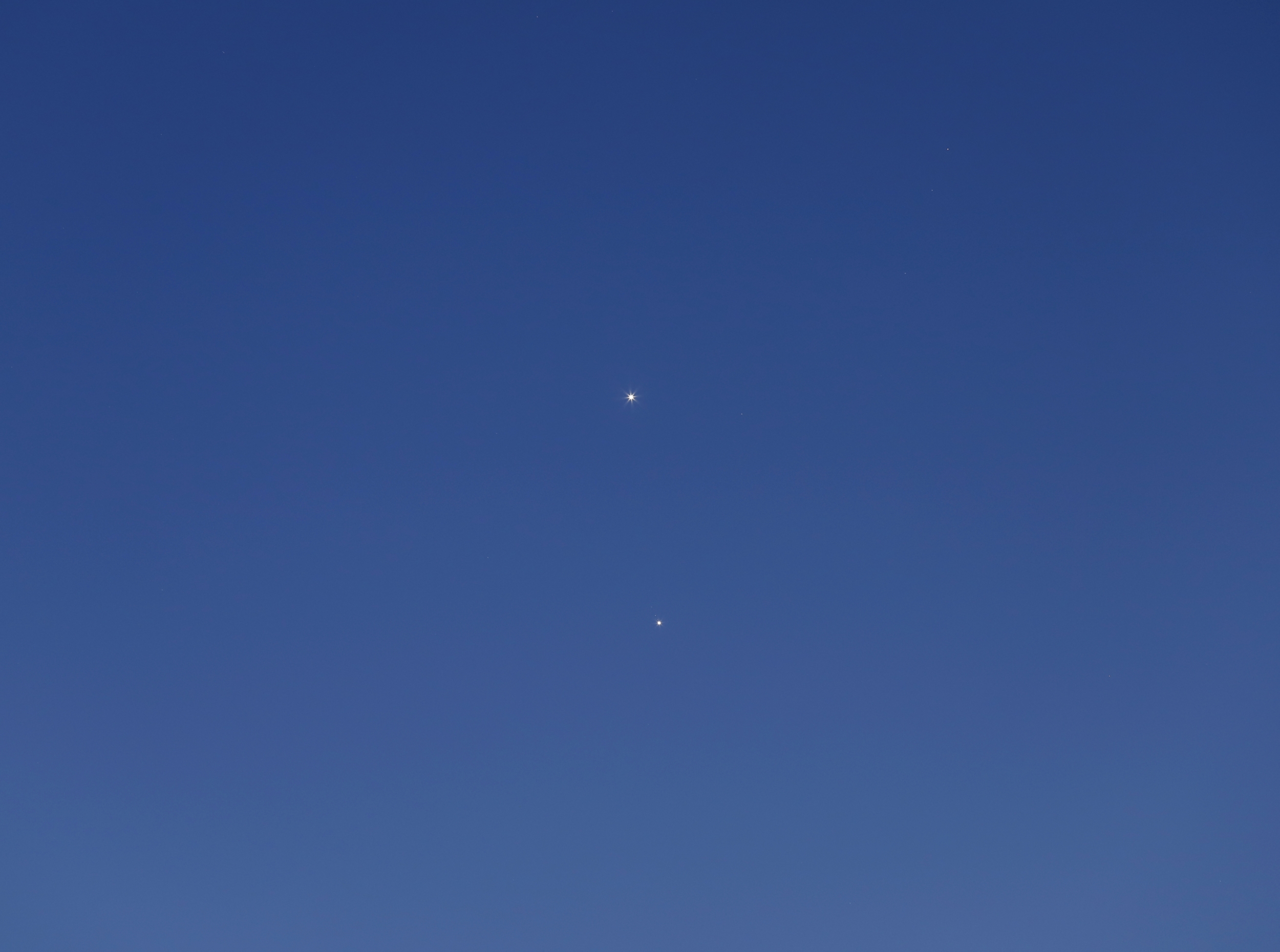 Najbližšie k sebe však uvidíme Venušu a Jupiter 1. a 2. marca, na oblohe ich bude deliť len okolo 40 uhlových minút. Konjunkcia týchto planét (29′) nastáva 2. 3. ráno, no to sú ešte pod obzorom. Blízko pri sebe však budú tieto objekty len zdanlivo, v skutočnosti bude Venuša od nás vzdialená 204 miliónov kilometrov a Jupiter 864 miliónov kilometrov.