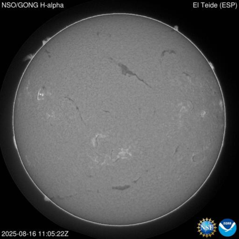 Spracovaný obrázok slabej erupcie (C1.31) zo 16.8.2025, 13:08 SELČ, N hore, E vľavo. A takto bola erupcia zaznamenaná z observatória El Teide.