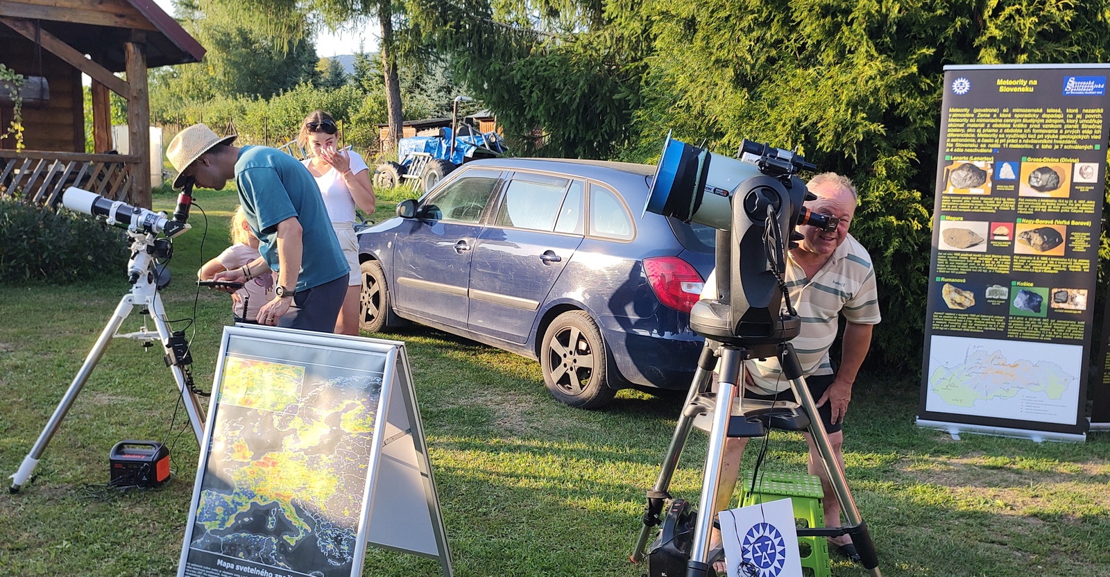 Diskusie pod altánkom či pri štyroch roll-upoch boli takmer nekonečné a zvlášť v noci pri pozorovaní. Od otázok jednoduchých sme sa dostali až k čiernym dieram, problémom singularity, mimozemským civilizáciám až k umelej inteligencii. Takmer každý vážny záujemca dostal od nás časopis Kozmos (ďakujeme kolegom z Hurbanova) či informačno-propagačné materiály. Najviac sa však tešili deti, keď im Rasťo dal možnosť vybrať si nejakú tú hvezdársku odmenu. Bonusom pre všetkých boli skutočné meteority, veď nik z nich nikdy žiadny v ruke nemal – a tentokrát sme mali kamenný aj železný. Samozrejme, všetci si ich chceli na pamiatku vyfotografovať, niektorí aj s hvezdárom...