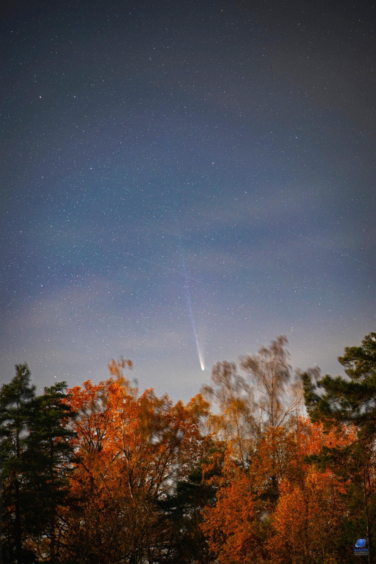 P. Horálek 18. 10. 2025, Nikon Z6III, Nikkor 135 mm, ISO 1000, f1,8, zásobník 40 x 20 s, montáž Vixen Polarie U. Slnečný vietor sa v tento deň krásne prejavil polárnou žiarou aj zmenou štruktúry plazmového chvosta kométy...