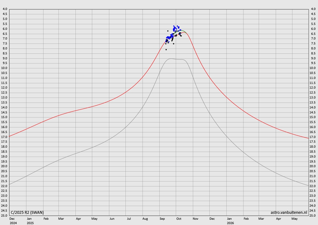 Priebeh jasnosti podľa G. van Buitenena (https://astro.vanbuitenen.nl/comet/2025R2)