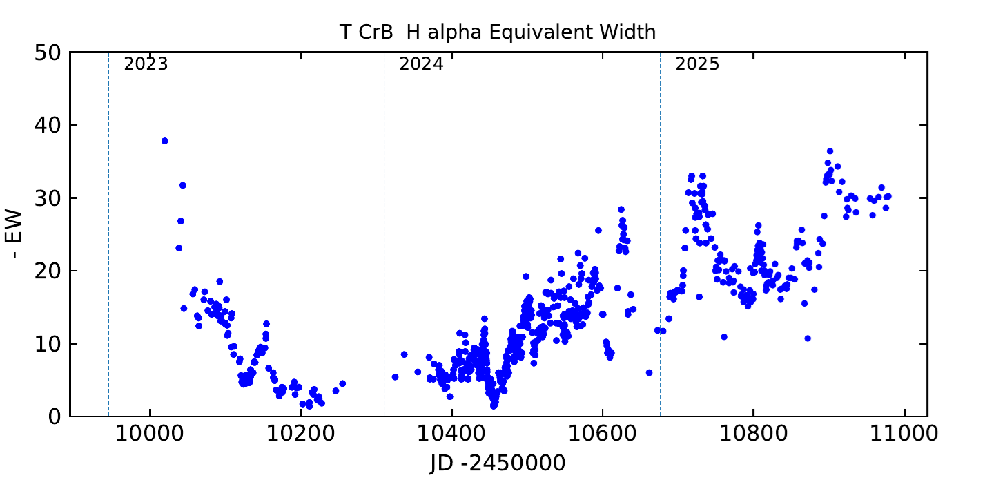 Rekurentná symbiotická nova T CrB (1786?, 1866, 1946, ?) môže vybuchnúť hocikedy. Všetky doterajšie predikcie zlyhali. Aktívna fáza, ktorá začala v roku 2015, skončila v apríli 2023. Jasnosť poklesla, emisné čiary prakticky vymizli, ostala len slabá Balmerova séria. V roku 2025 sa aktivita obnovila. Hrubú predstavu si môžeme urobiť meraním ekvivalentnej šírky čiary H-alfa (Obr. 3).