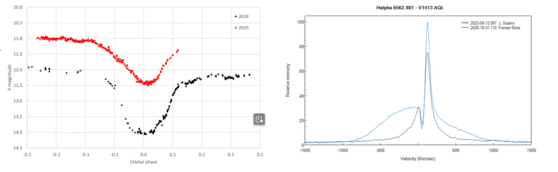 V1413 Aql je zákrytová symbiotická dvojhviezda. Orbitálna perióda je v tomto prípade 434 dní. Zákryty teda nie sú vzácne, zato každý iný. Posledný zákryt nastal koncom roka 2025 počas vzplanutia symbiotického systému, zatiaľ čo v predchádzajúcom roku nastalo zatmenie v pokojnej fáze. Na Obr. 6 vidieť, že rozdiel sa prejavuje v tvare svetelnej krivky aj v profile emisnej čiary H-alfa. Zdá sa, že počas vzplanutia je akréčny disk väčší a tým nie je zakrytý úplne. To by mohlo vysvetľovať minimum bez plochej fázy a široké krídla v profile spektrálnej čiary.