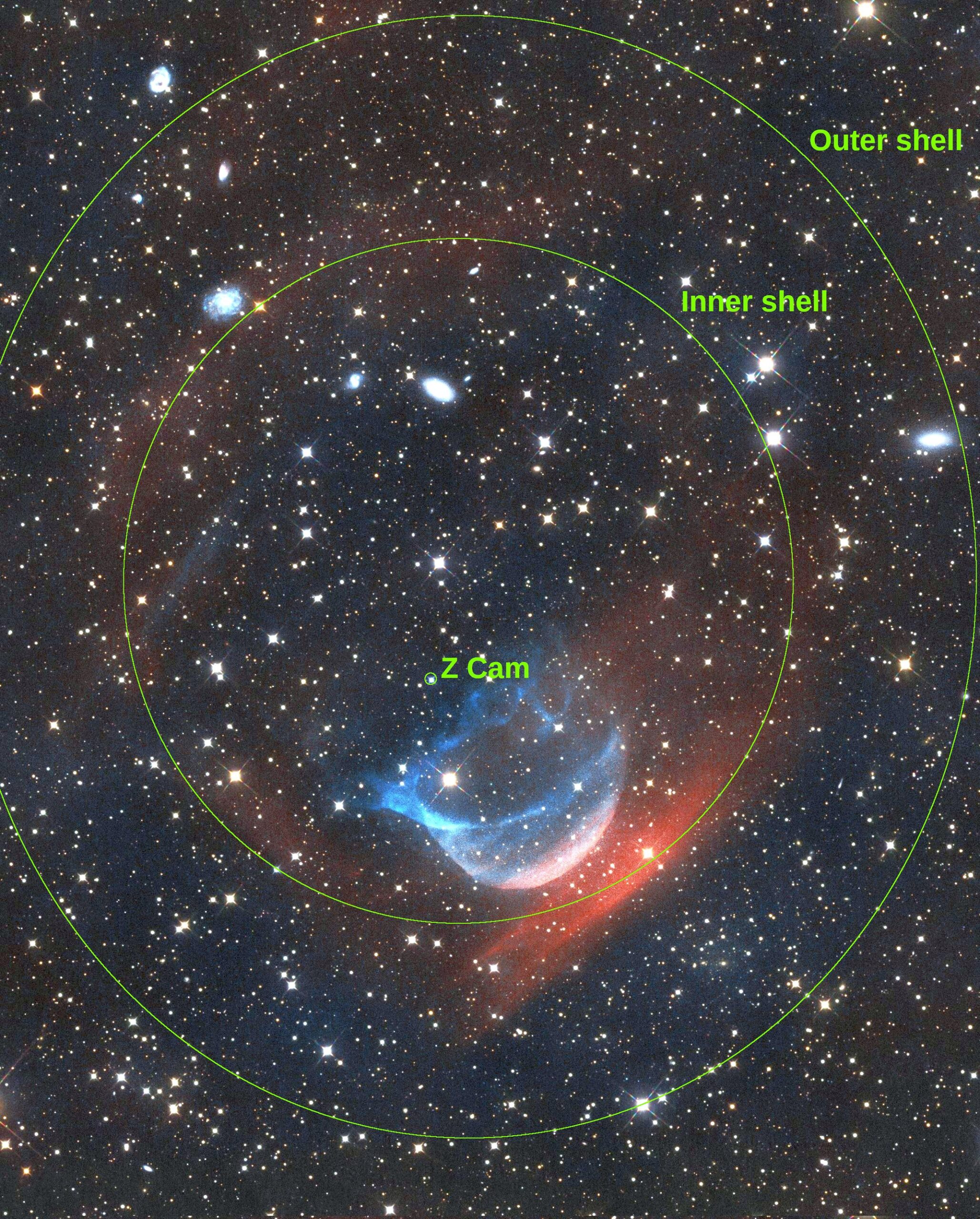 Obr. 7 Výsledok pilotnej kampane na zobrazenie obálok po výbuchoch novy Z Cam. Červená farba patrí emisii vodíka H-alfa, modrá emisii v zakázanej čiare kyslíka [OIII]. Autori snímok: R. Barsa, M. Gnida, K. Kolomazník, P. Kollárik, A. Kováč, M. Mančuška, D. Volný.