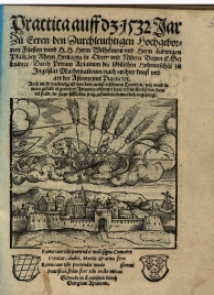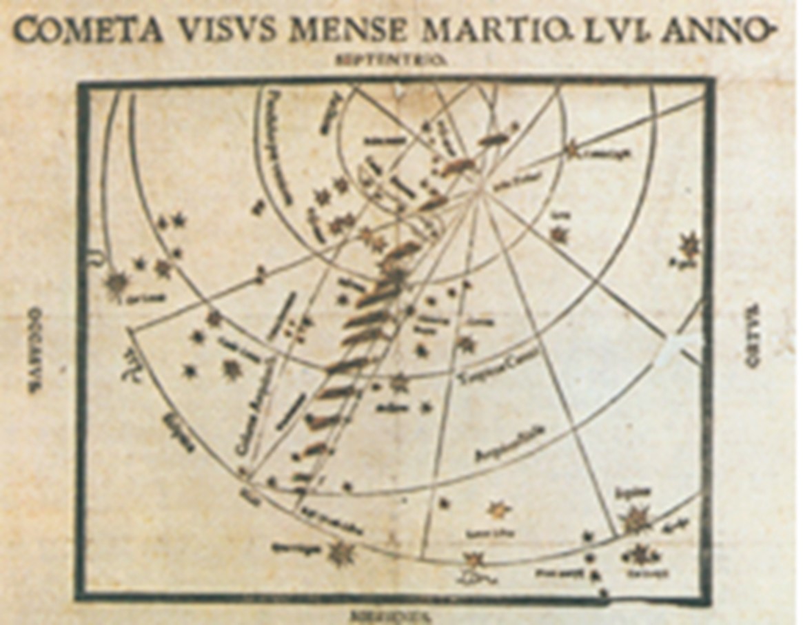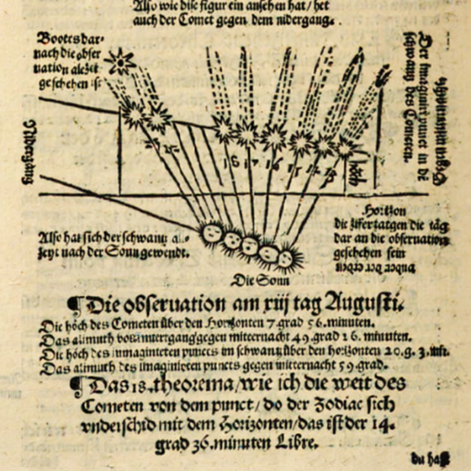 Peter Apianus: schéma pozorovania kométy z 18. augusta 1531, publikovaná v tlači Practica auff dz. 1532 Jar (Landshut, 1532). Diagram zachytáva polohu kométy a smerovanie jej chvosta vzhľadom na Slnko.