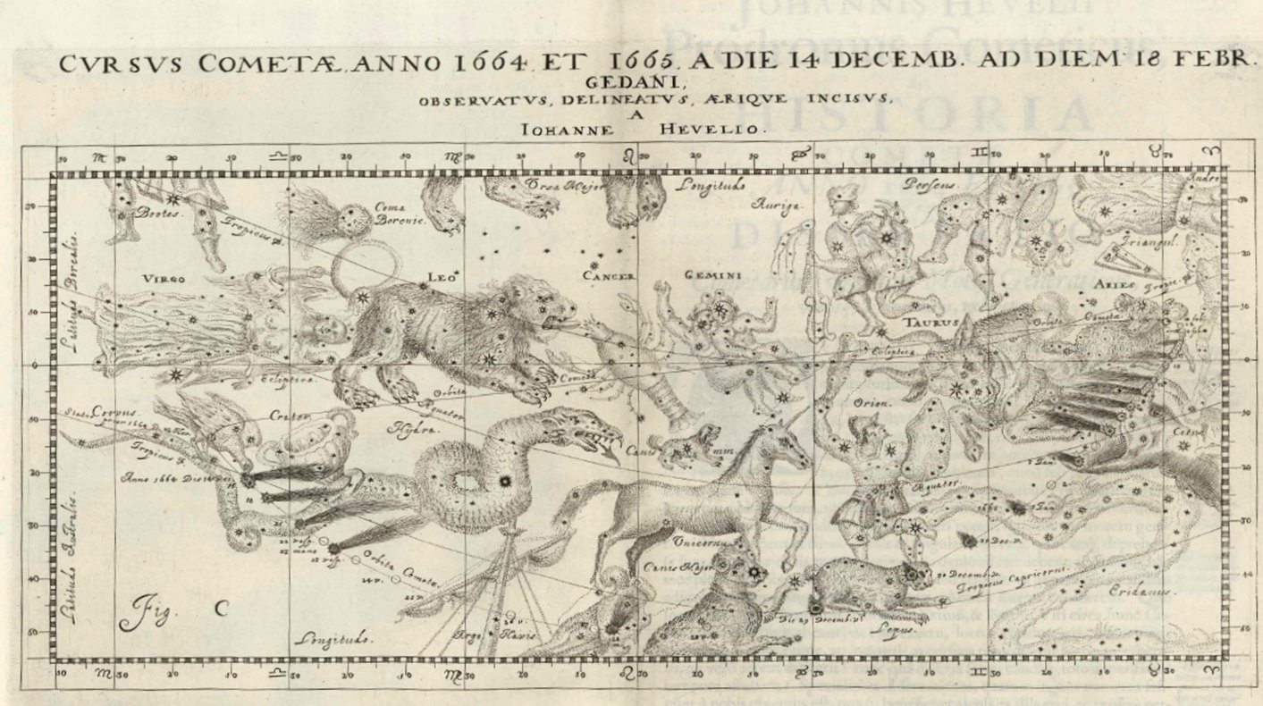Dobová rytina Johannesa Hevelia „Cursus Cometae 1652“ z diela Cometographia (Gedani, 1668), vložená medzi s. 130–131. Ilustrácia zachytáva zdanlivú dráhu kométy C/1652 Y1 medzi súhvezdiami.