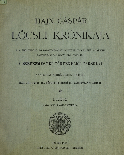 Pramene: HAIN, Caspar. Zipserische, oder Leutschauerische Chronica undt Zeitbeschreibung. Ed. Baal Jeromos, Förster Jenő, Kauffmann Aurél. Lőcse, 1910–1913.