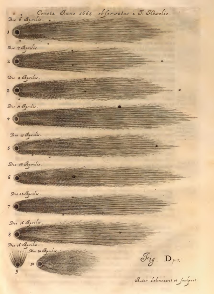 Johannes Hevelius: Zobrazenie kométy z apríla 1665. Tabuľa z diela Descriptio Cometae (Gedani, 1666), vložená medzi s. 4–5, zachytáva postupný vzhľad kométy v dňoch 6. – 20. apríla 1665 a predstavuje dobové systematické astronomické spracovanie úkazu.