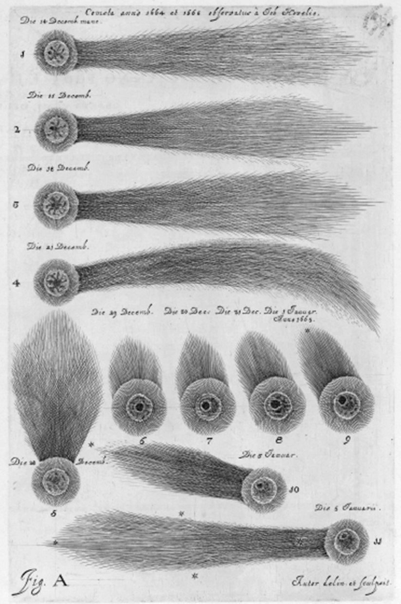 Johannes Hevelius: znázornenie rozličných podôb hlavy a chvosta kométy z rokov 1664 – 1665 pri jej postupných pozorovaniach. Zdroj: HEVELIUS, Johannes. Prodromus Cometicus. Gedani, 1665.