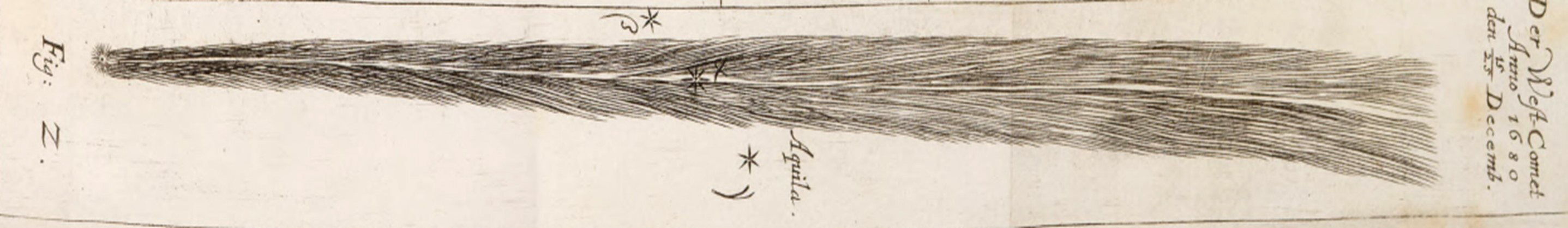 Gottfried Kirch: Zobrazenie dlhého chvosta kométy z rokov 1680/1681. Výrez z obrazovej prílohy diela Neue Himmels-Zeitung (1681), fig. Z. Ilustrácia je v súlade s dobovými správami o mimoriadne dlhom chvoste kométy.