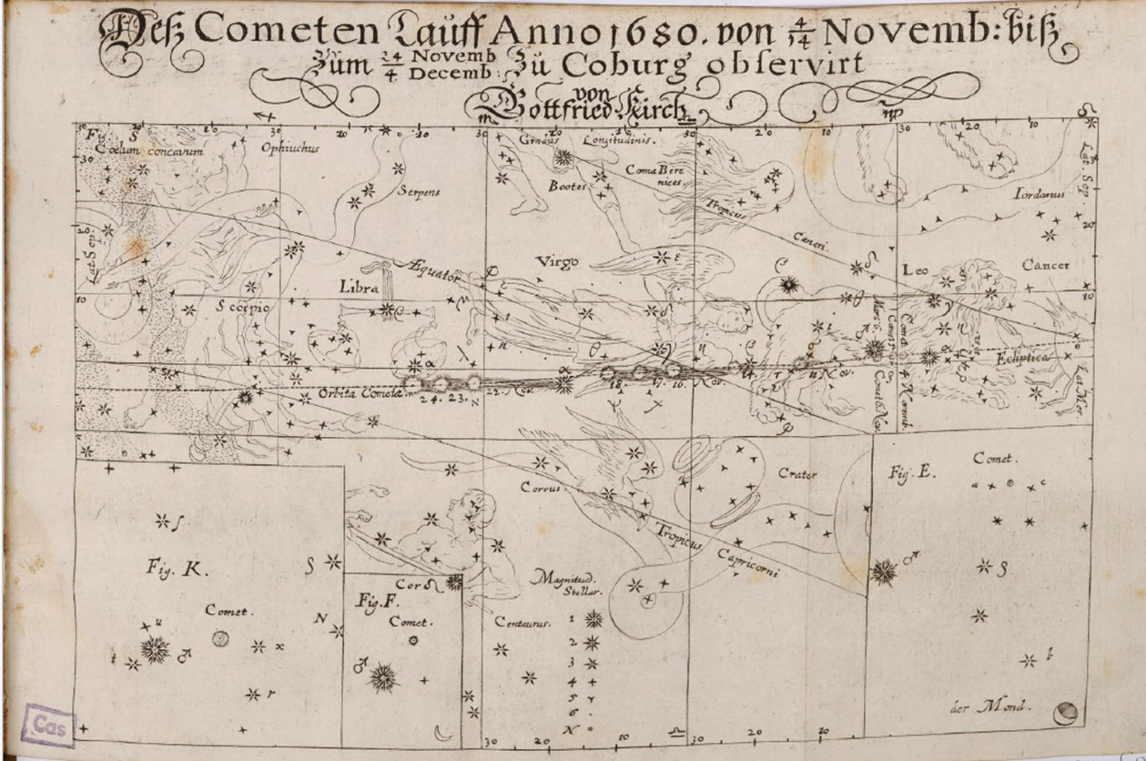 Gottfried Kirch: Dráha veľkej kométy z rokov 1680/1681. Rytina z diela Neue Himmels-Zeitung (1681), znázorňujúca postup kométy na oblohe podľa Kirchových pozorovaní. Obrazová príloha zodpovedá Hainovmu opisu výraznej kométy pozorovanej na prelome rokov 1680 a 1681.