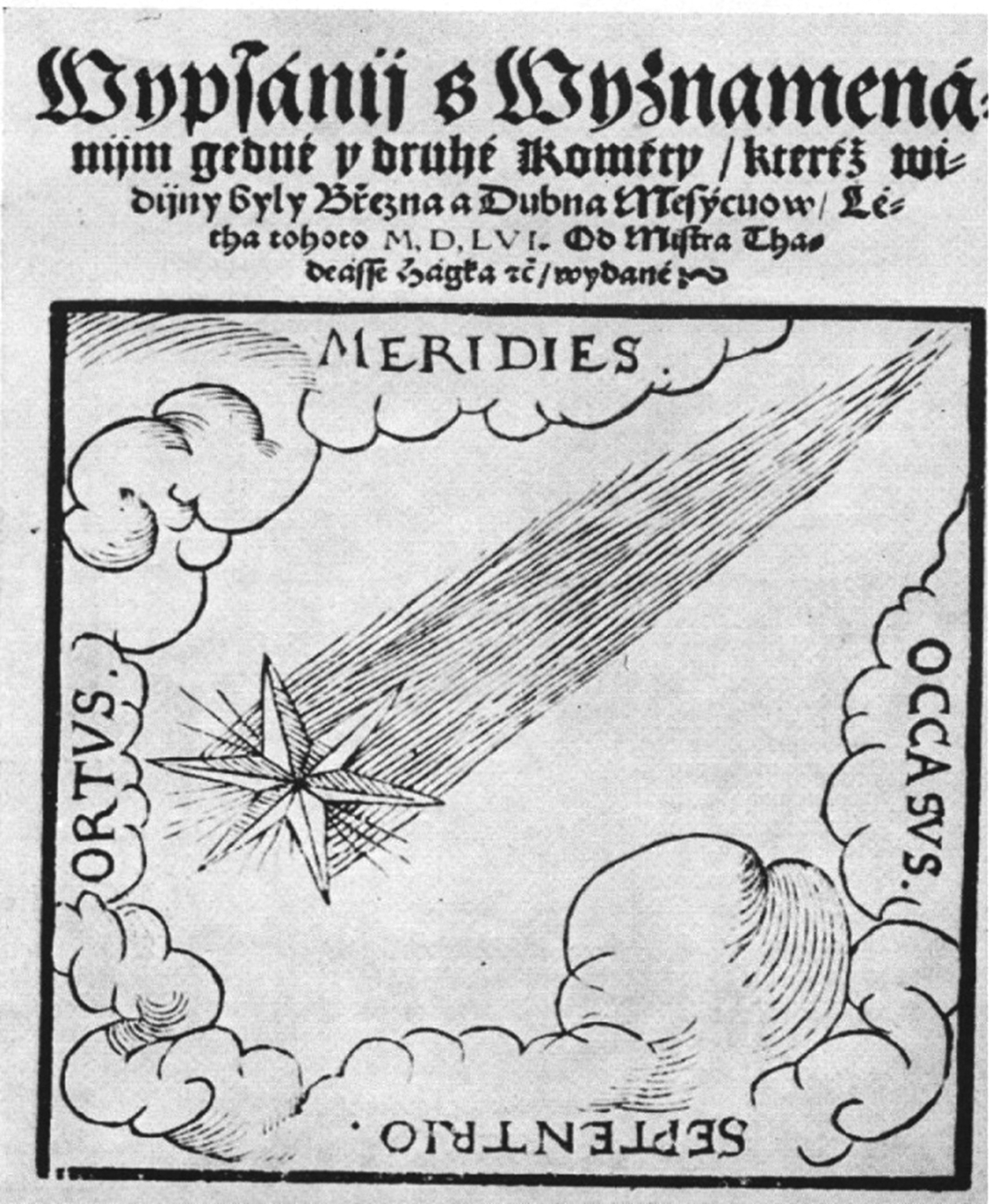 Titulný list spisu Tadeáša Hájka z Hájku Vypsání s vyznamenáním jedné i druhé kométy, kteréž vidíny byly března a dubna měsíců léta tohoto MDLVI (1556). Drevorez zobrazuje kométu s výrazným chvostom a orientáciu úkazu podľa svetových strán.