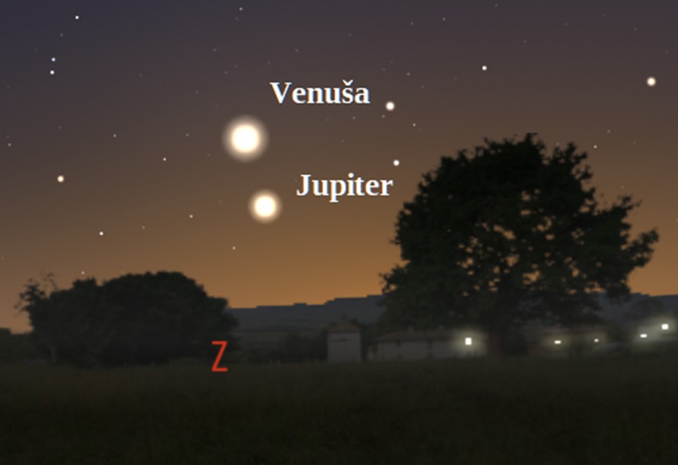 Rekonštrukcia večernej oblohy nad západným obzorom nad Levočou 26. marca 1644 v programe Stellarium.