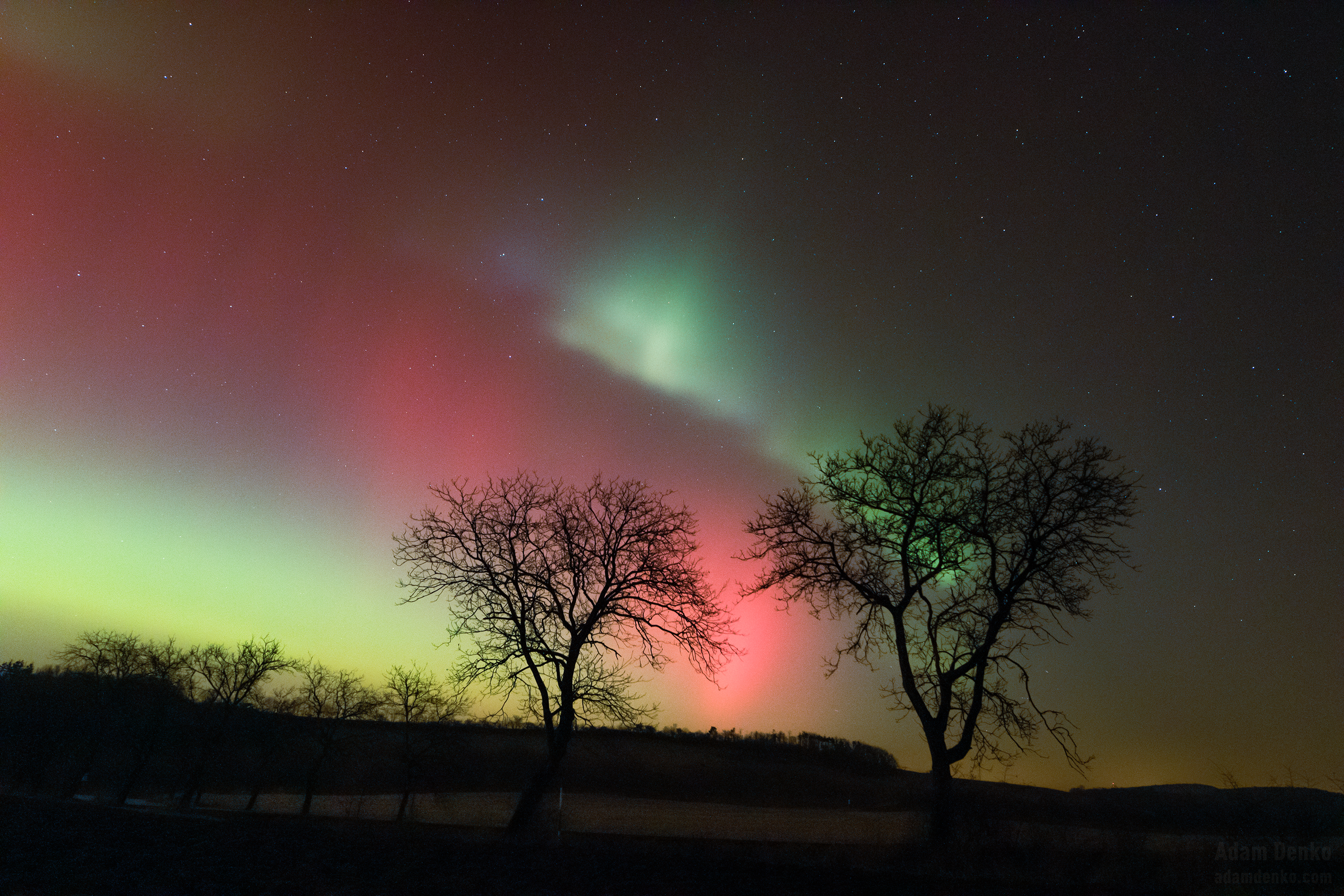Dosti však již teorií a představ. Na jejich výsledky si počkejme, byť se na ně jistě těšíme. My však máme před sebou fotografii mladého českého astrofotografa Adama Denka, který využil jasné oblohy, bezměsíčné noci a prudkého nárůstu indexů geomagnetické aktivity, aby pořídil snímek neobvyklé polární záře. Ano, napsali jsme, že polárních září u nás bylo nyní hodně, ale tato byla opravdu netradiční.