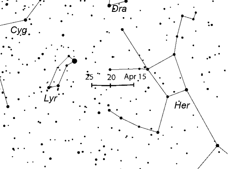 Pohyb radiantu Lyríd, zdroj IMO