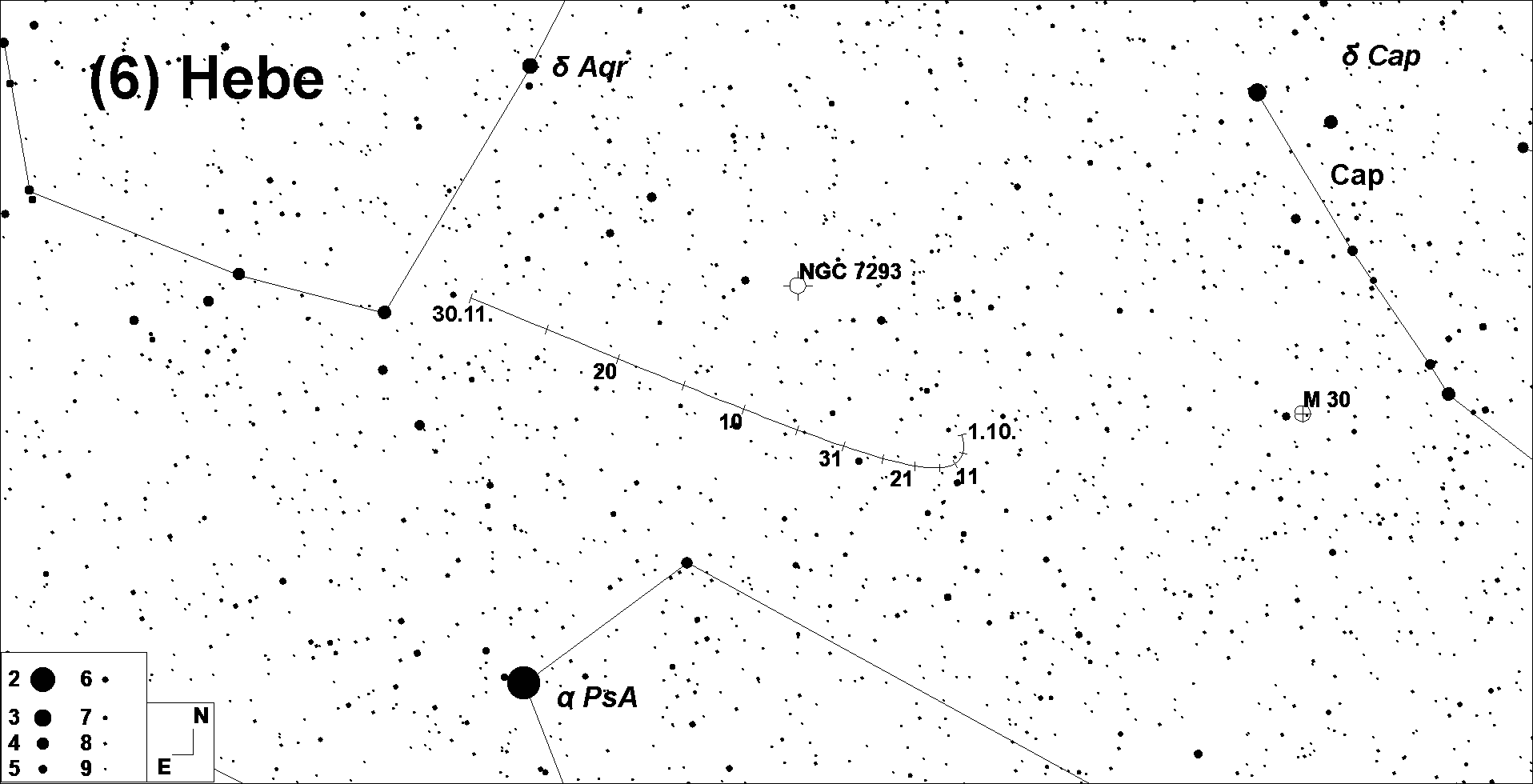 V októbri bude najjasnejším asteroidom (6) Hebe v súhvezdí Vodnár s 8,4 mag.